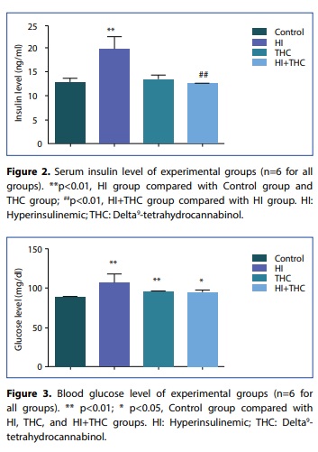 고인슐린증을 유도한 쥐들과 비교하여 대마초의 THC를 꾸준히 섭취한 쥐들은 THC를 섭취하지 않은 정상적인 쥐들과 동일한 혈중 인슐린 수준을 유지하였다.