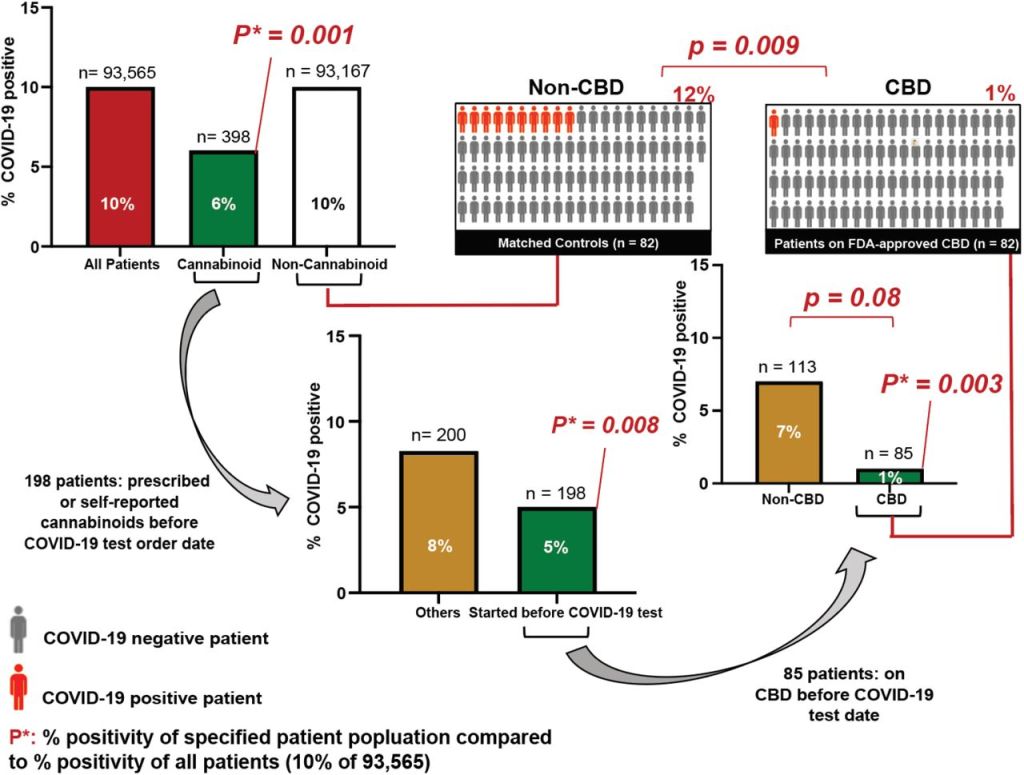 연구진은 대마초의 CBD가 SARS-CoV-2 바이러스 감염을 막는다는 가설을 입증하기 위해 시카고 대학 부설 병원의 입원 환자 93,565 명의 신종 코로나 바이러스 감염증 검사 결과와 대마초 사용 여부를 조사하였다.